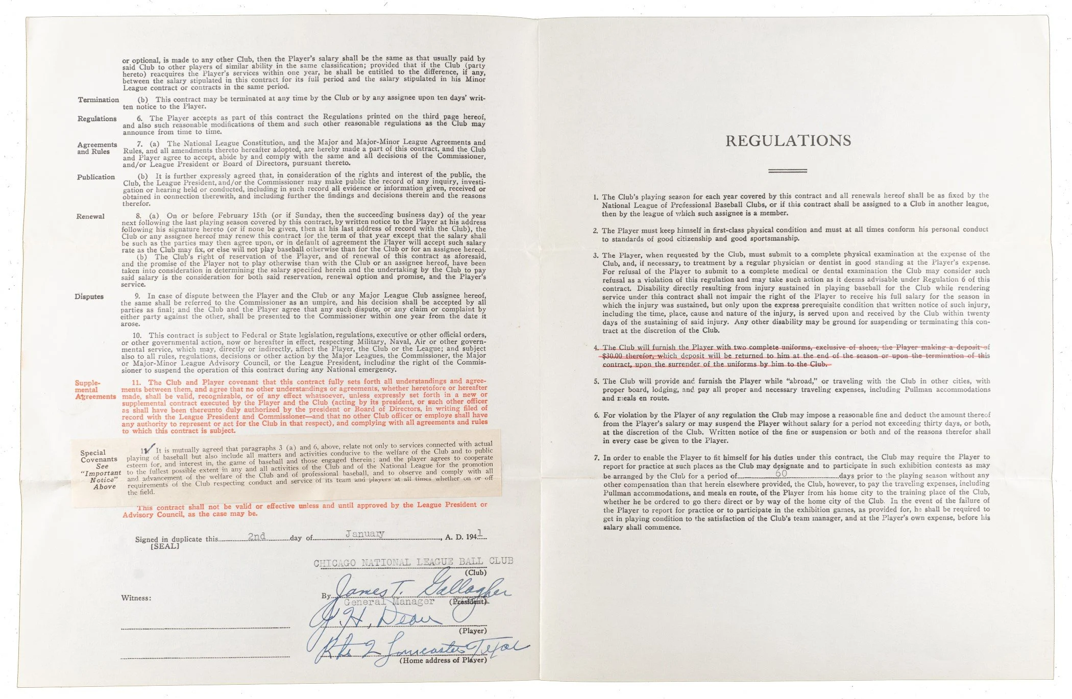 This 1941 contract between Dizzy Dean and the Chicago Cubs marks the final chapter of the Hall of Famer’s major league playing career. Signed during his brief stint with the Cubs, the document represents a key piece of baseball history from one of the game's most colorful pitchers.