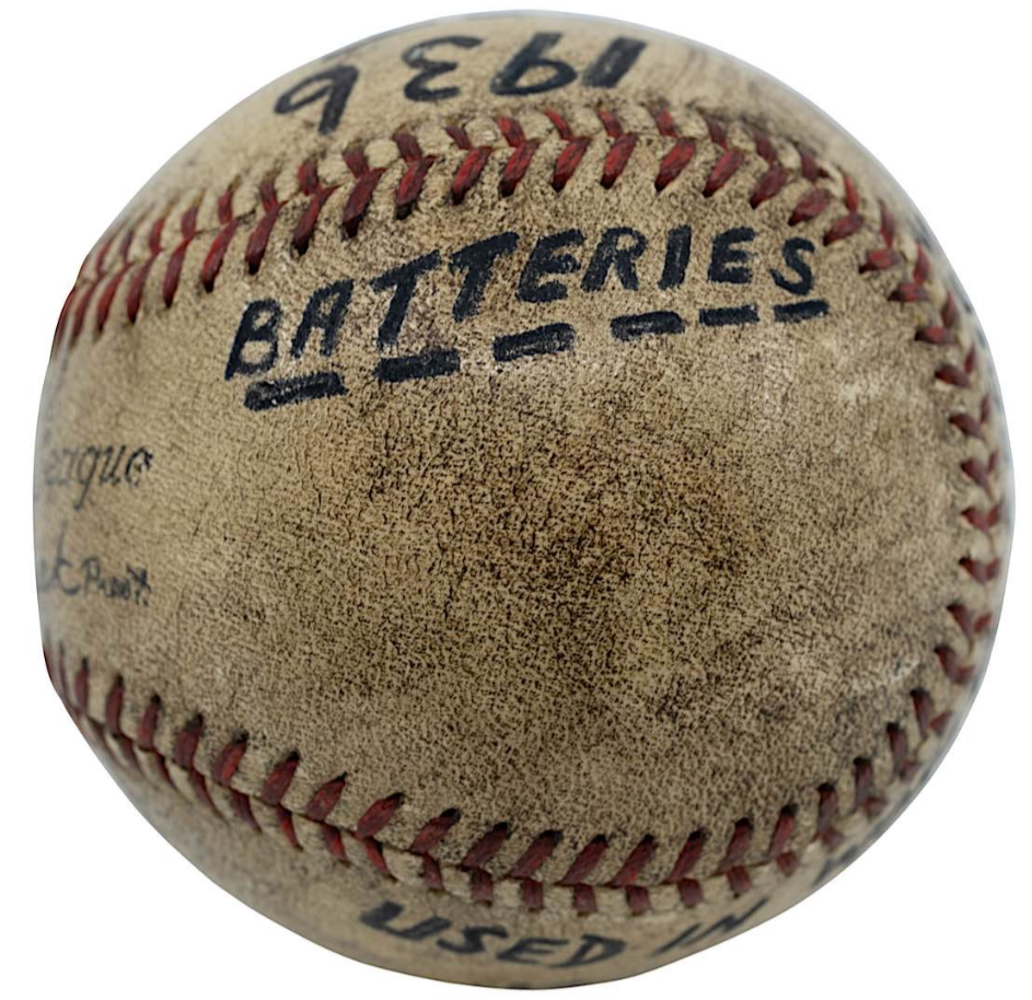 Game-used Official National League (ONL) baseball from the 1936 World Series, personally sent by umpire George Magerkurth. Used during Game 1, where the Yankees defeated the Giants 4–2, this historic ball is marked in black ink with the score and details, capturing the Yankees’ first World Series appearance without Babe Ruth. Showcasing Hall of Famers like DiMaggio, Gehrig, Hubbell, and Ott, this artifact is a tangible link to one of baseball’s most iconic eras.